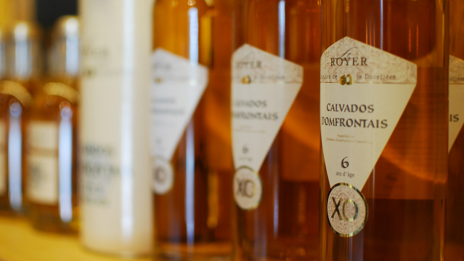 Calvados Domfrontais AOC spécifique de notre région est obtenu par la distillation du Poiré vieilli en fûts de chêne (de 4 ans à 25 ans pour nos Calvados Domfrontais)