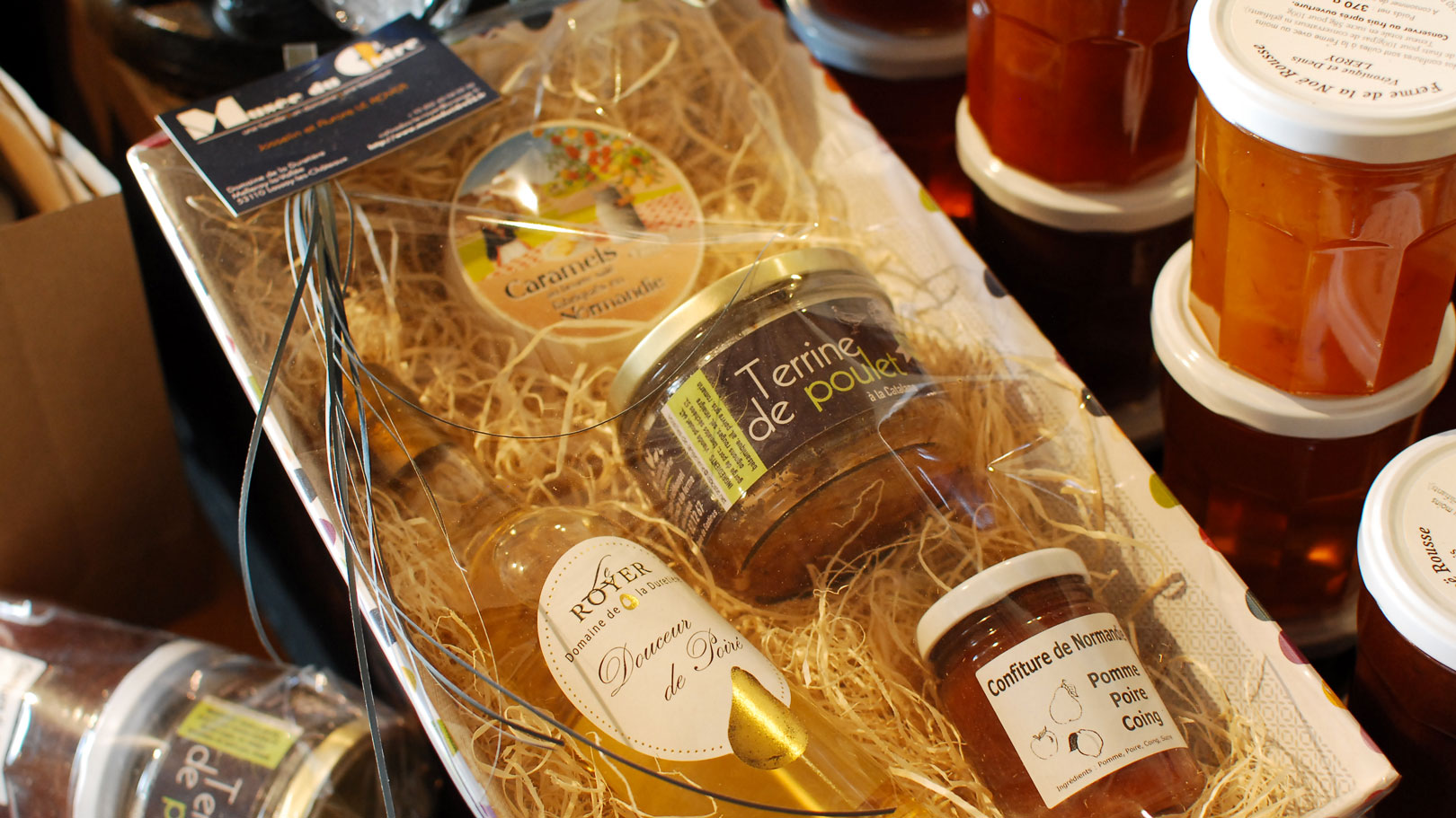 Produits locaux (confiture, miel, biscuits, caramel, terrine et souvenirs (bolées, verres, objets en bois)